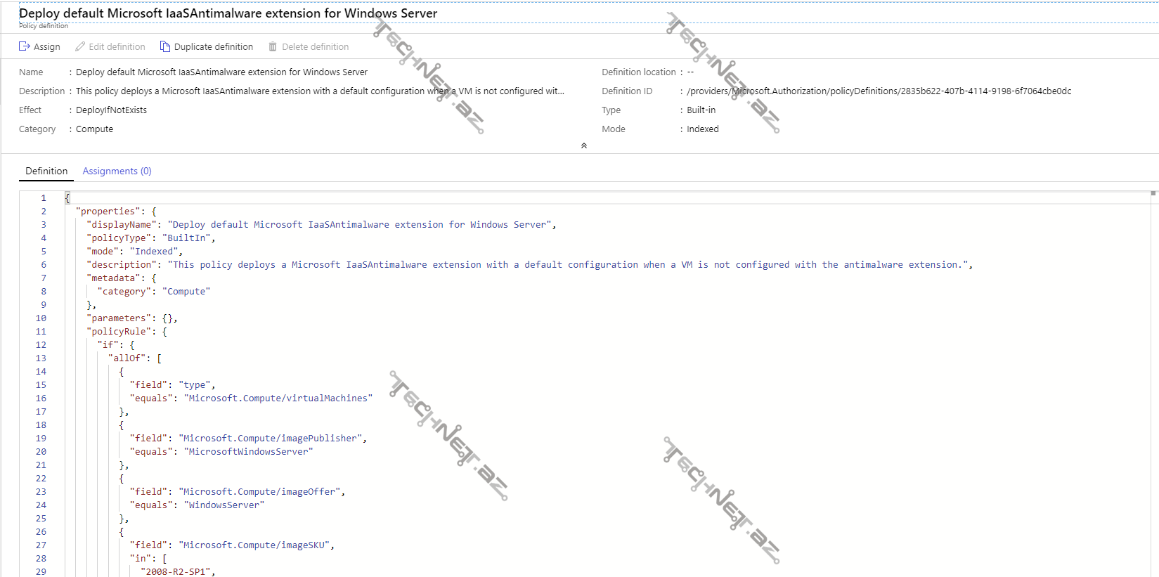 - Demo məqsədilə hər hansı bir template seçək. Nümunədə “Deploy default Microsoft IaaSAntimalware extension for Windows Server” seçimini edək. Bu Policy təyin edilmiş Resource Groupda yaradılan bütün VM-lərə avtomatik olaraq Antimalware tətbiqi deploy ediləcəkdir.