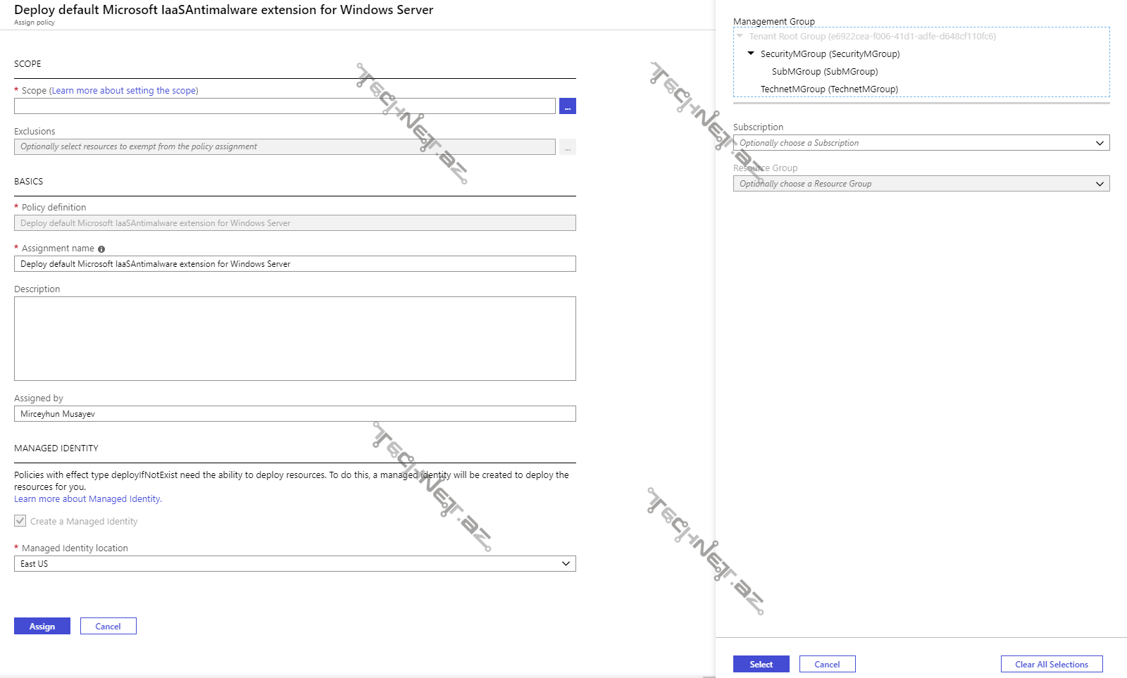 - İstədiyiniz Scope-u seçdikdən sonra “Select” və “Assign” düymələrinə click edərək Policy-ni tətbiq edə bilərik.