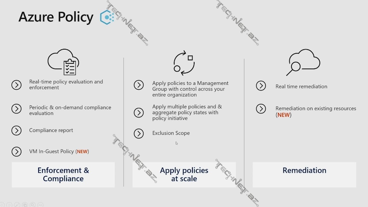Azure policy xidməti vasitəsilə siz bir çox qaydaları şirkət resurslarına təyin edərək, bu qaydalar və standartların hansı səviyyədə icra edildiyinə nəzarət etdə bilərsiniz. Ümumi stadartlardan yayınma halları artdıqda isə məcburi şəkildə riayət olunmasını təmin etmək mümkündür.