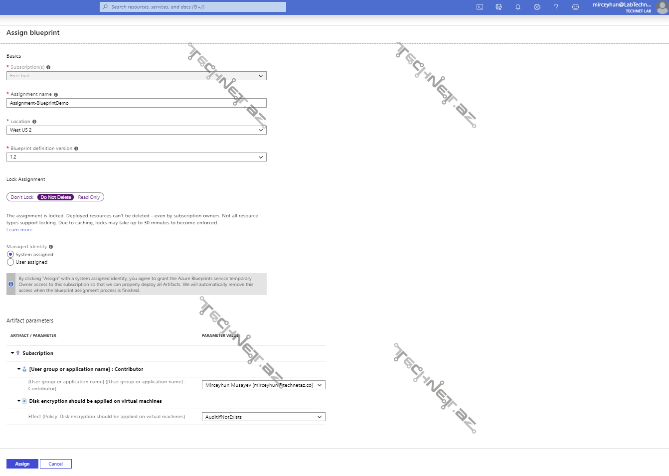 9. Bu pəncərədə, Blueprint-in hansı regionda olacağını, versiyasını, Lock növünü və identity olaraq System ya User assigned olacağın seçə bilərik. (System olaraq seçdiyimizdə, azure tərəfindən müvəqqəti identity yaradılır, Blueprint assign olduqdan sonra isə, həmin İdentity bazadan silinir.)