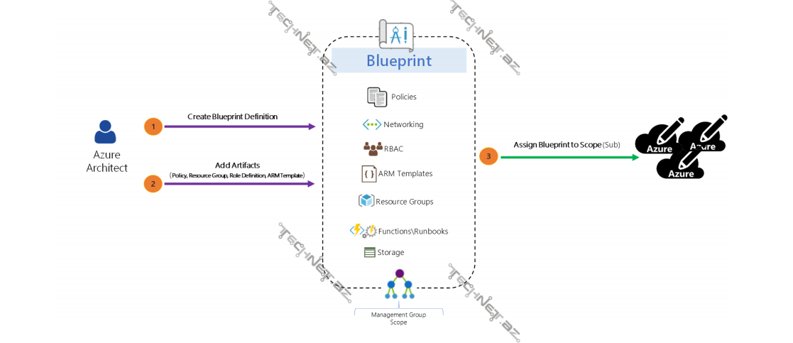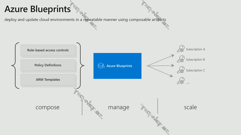 Azure Blueprint əsasən, şirkət standartlarının təyini üçün istifadə edilir. Blueprint, Definition-lardan ibarətdir. Azure Governance xidmətinin bir hissəsi olan bu funksiya vasitəsilə Artifact -lar təyin olunur. Hansı ki, onlar da öz növbəsində assign olduqları subscription -larda müəyyən limitlər və ya pre-configuration-lar edir.
