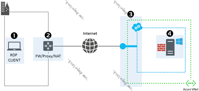 Bunun üçün sadəcə olaraq, Network Security Group (NSG) -da internetdən virtual maşına 3389 -cu port üzrə qoşulma icazəsi verməlisiniz. Ümumiyyətlə Bu tip qoşulmaların kontrolu yalnız NSG tərəfindən idarə olunur. Burada ən böyük problemlərdən biri hər bir virtual maşın umun ayrıca Public İP verilməli olduğudur.