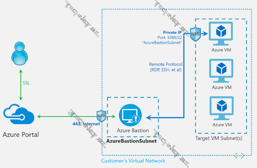 Bundan öncəki metoddan əsas fərqi, daxildə Firewall-dan sonra “jump-box” deyilən bir serverin olmasıdır. Jump-box serverə bəzən “Bastion” da deyilir. Istifadəçilər daxili şəbəkədə yerləşən hər hansı virtual maşına qoşulmaq üçün ilk öncə jump-box serverə qoşulur. Sonra isə müraciət etdikləri serverə keçid edirlər. Bu cür yanaşmanın bir neçə müsbət özəlliyi vardır. Jump-box dediyimiz server maksimum təhlükəsizlik qaydaları tətbiq edilir. Hətta xüsusi proqramları bu serverə yazaraq, qoşulan istifadəçilərin serverlərdə nə iş gördüyünü izləmək, qeydə almaq və sairə təhlükəsizlik tədbirlərini həyata keçirtmək mümkündür. Jump box servelərindən bir çox şirkətlər istifadə edir. Bir çox Cloud servislərində eləcə də Azure platformasında “Bastion” server özəlliklərin konfiqurasiya etmək mümkündür. Azure Bastion klassik jump-box metodundan bir çox özəlliyinə görə fərqlənir. Ən əsas üstünlük isə, Azure Bastion-un PaaS xidməti olaraq heç bir əlavə konfiqurasiya ehtiyac olmadan istifadəsinin mümkünlüyüdür. Şəbəkədəki Virtual maşınlara publik İP ünvan vermədən Azure Bastion vasitəsilə portal üzərindən RDP qoşulma seansları yaratmaq olur.