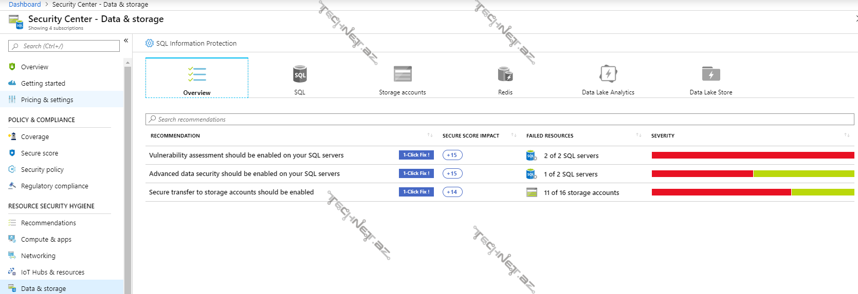 - Data & Storage (Məlumat və Saxlanma)– Adından bəlli olduğu kimi bu modul, məlumatların və məlumat saxlama cihazlarının təhlükəsizliyini qorumaq, izləmək və müəyyən analizlər aparmaq üçün nəzərdə tutulub. Burada siz Storage account-larla bağlı tövsiyə və xəbərdarlıqlarla yanaşı, SQL database, Redis və Data Lake Store barədə təhlükəsizlik məlumatların görə bilərsiniz.