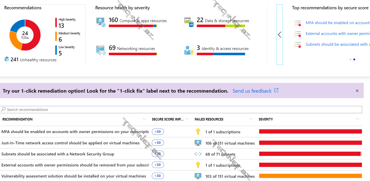 - High severity – Müəyyən resurslarda (virtual maşın, proqram, network security group və s.) ciddi boşluqlar aşkar edilmişdir və diqqət tələb olunur.