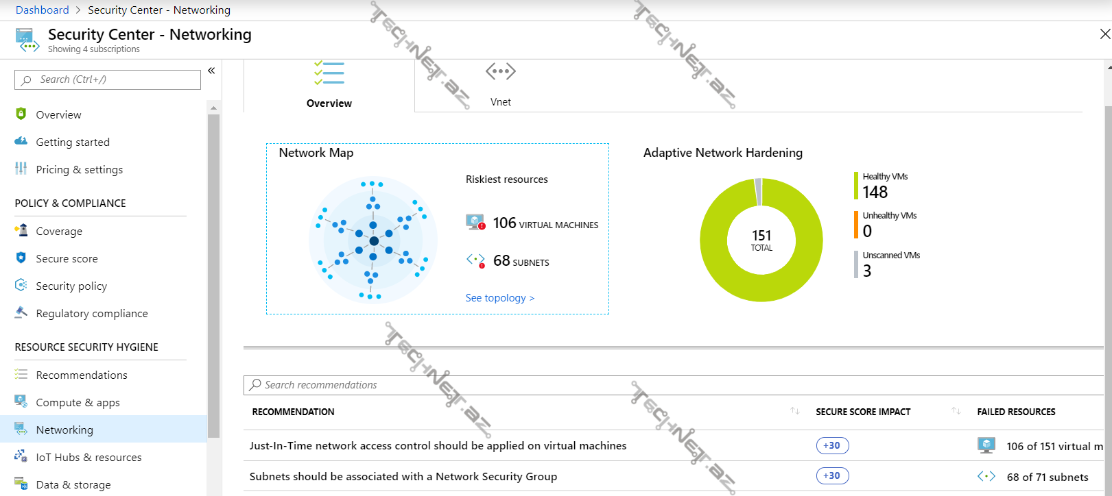 - Networking (Şəbəkə) – Şəbəkə ilə bağlı olan resursların təhlükəsizliyi analiz edilir və nəticələr bu səhifədə əks olunur. Bundan əlavə, “Networking” bölməsində şəbəkə topologiyası göstərilir. Qeyd olunan topologiya vasitəsilə isə virtual şəbəkələr, alt şəbəkələr və ümumi şəbəkə resursları dizaynı barədə məlumat olmaq olar.