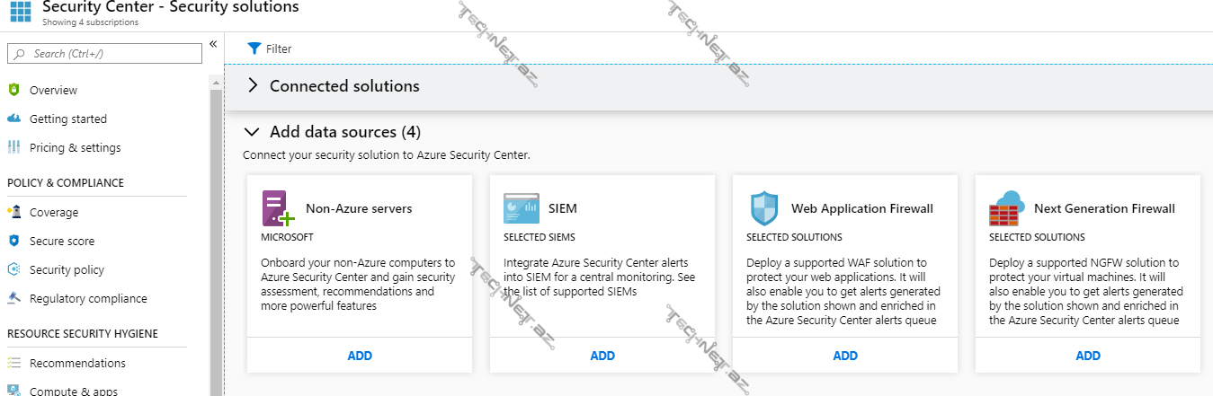 - Security Solutions (Təhlükəsilzik həlləri) – Bu pəncərədə siz, Azure Security Center-i kənar şirkətlərin (PaloAlto, Barracuda,Chekpoint və s) təhlükəsizlik həlləri ilə inteqrasiya edə bilərsiniz. Adətən bunlar SİEM (Security information and event management), Next Generation Firewall və ya WAF (Web Application Firewall)