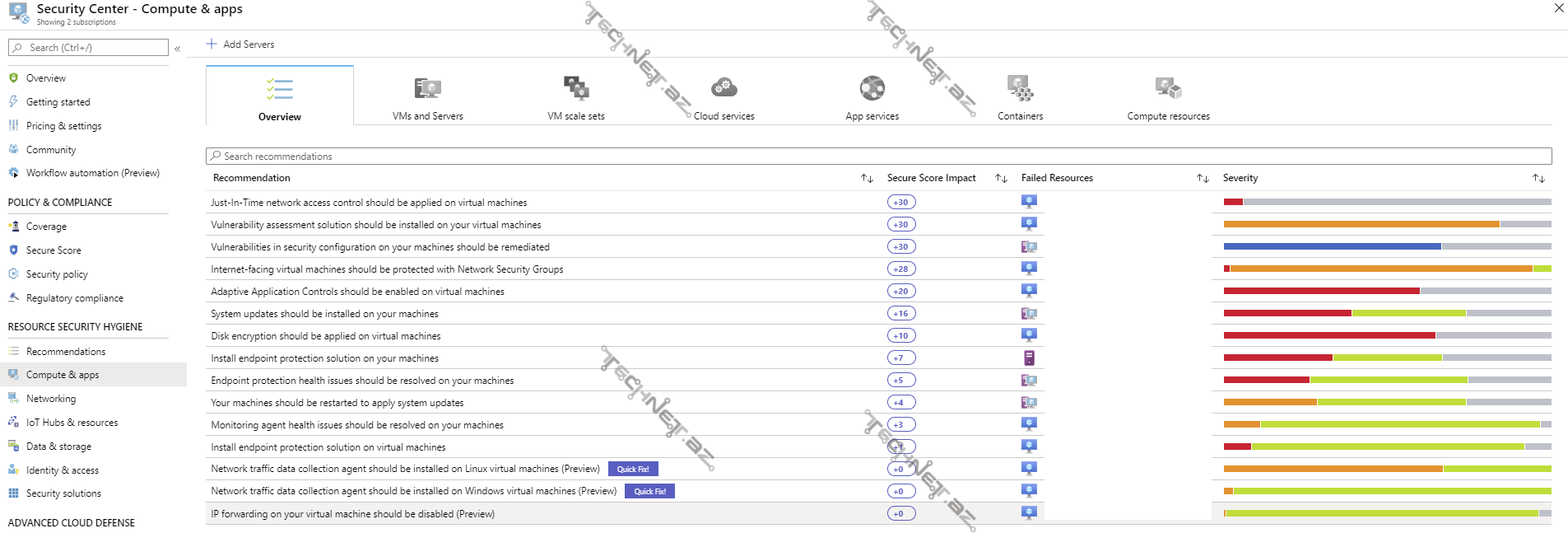 - Compute and Apps (Hesablama və Tətbiqlər)– Bu səhifə vasitəsilə Azure Security Center – ə virtual maşınlar, application-lar və digər resurslar əlavə edə bilərik. Bundan əlavə Compute and Apps bölməsində resursları tiplərə görə filterasiya edib, təhlükəsizlik baxımından vəziyyətləri haqqında daha detallı məlumat almaq mümkündür.