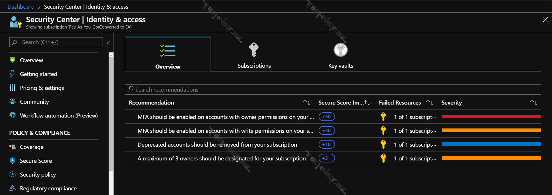 - Recommendations (Tövsiyələr) – Təhlükəsizlik siyasətində (Security Policy) təyin edilmiş təhlükəsizik tədbirləri əsasında tövsiyyələri yaradılr. Boşluqların aradan qaldırılması əsasında isə Secure score (Təhlükəsizlik balı) artır. Bu tövsiyyələr kritik olma dərəcələrinə görə 3 yerə bölünür: