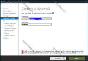 5.2.Yeni yaratdığımız istifadəçi adı və şifrəni Azure AD cloude Connect sazlamasındadı açılmış pəncərədə qeyd edirik və Next sıxmaqla növbəti mərhələyə keçirik.