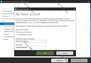 7.Növbəti mərhələdə biz sinxronizasiya üçün istifadə ediləcək lokal AD istifadəçi adının məlumatlarını daxil edirik. Bu istifadəçi adı domain administrator və ya global administrator ola bilməz. Məsləhət olunur ki sinxronizasiya üçün Users qrupuna daxil olan ayrıca istifadəçi adı istifadə olunsun.Açılmış pəncərədə ADDC yə daxil olmadan belə istifadəçi adını yaratmaq mümkündür. Müvafiq məlumatları daxil edib OK sıxırıq. Bundan sonra Next sıxmaqla növbəti mərhələyə keçirik.