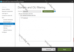 9.Bu mərhələdə lokal AD –dəki hansı OU daxilindəki obyektlərin Azura sinxronizasiya edilməsini istədiyimizi qeyd edirik. Bildiyiniz kimi lokal AD də servislər üçün yaratdığımız istifadəçi adları, eləcə də Azura daxil olması lazım olmayan istifadəçi adları da saxlanıla bilər.Təhlükəsizlik məqsədilə yaxşı olar ki Azura daxil olması gərəkən istifadəçi adlarının yerləşdiyi OU nu seçək. Mən test platforması olduğu üçün Sync All Domain and OUs seçimini edib, Next düyməsini sıxmaqla növbəti mərhələyə keçirəm.