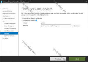 11.Bu mərhələdə hansı qrup daxilində olan istifadəçi adlarının Azure AD –yə sinxronizasiya ediləcəyini qeyd edirik. Yaxşı olar ki Azure də işləyəcək istifadəçilərin daxil olunacağı qrupu burada göstərək. Test platforması olduöundan mən Sycnchoronize all Users and devices seçirəm, Next vurmaqla növbəti mərhələyə keçirəm.