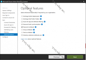 12.Açılmış pəncərə bizə digər funksiaların aktivləşdirilməsi üçün şərait yaradır. Bu pəncərədəki Password writeback seçimi imkan veriri ki, istifadəçi Azure portalı üzərindən şifrəsini dəyişərsə, həmin şiftə lokal ADDS-yə sinxronizasiya olunsun. Bu seçimi qoymasaq, şifrələr yalnız birtərəfli olaraq lokal AD dən Azure AD yə ötürüləcəkdir. Next sıxmaqla növbəti mərhələyə keçirik.
