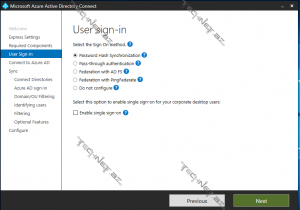 Pass-through Authentication: Bu seçim zamanı lokal AD DS dəki şifrə və ya hash-lər Azure AD-yə ötürülmür, authentikasiya zamanı xüsusi agentlər vasitəsilə Azure AD lokal ADDS-dən şifrənin doğruluğu yoxlanır.