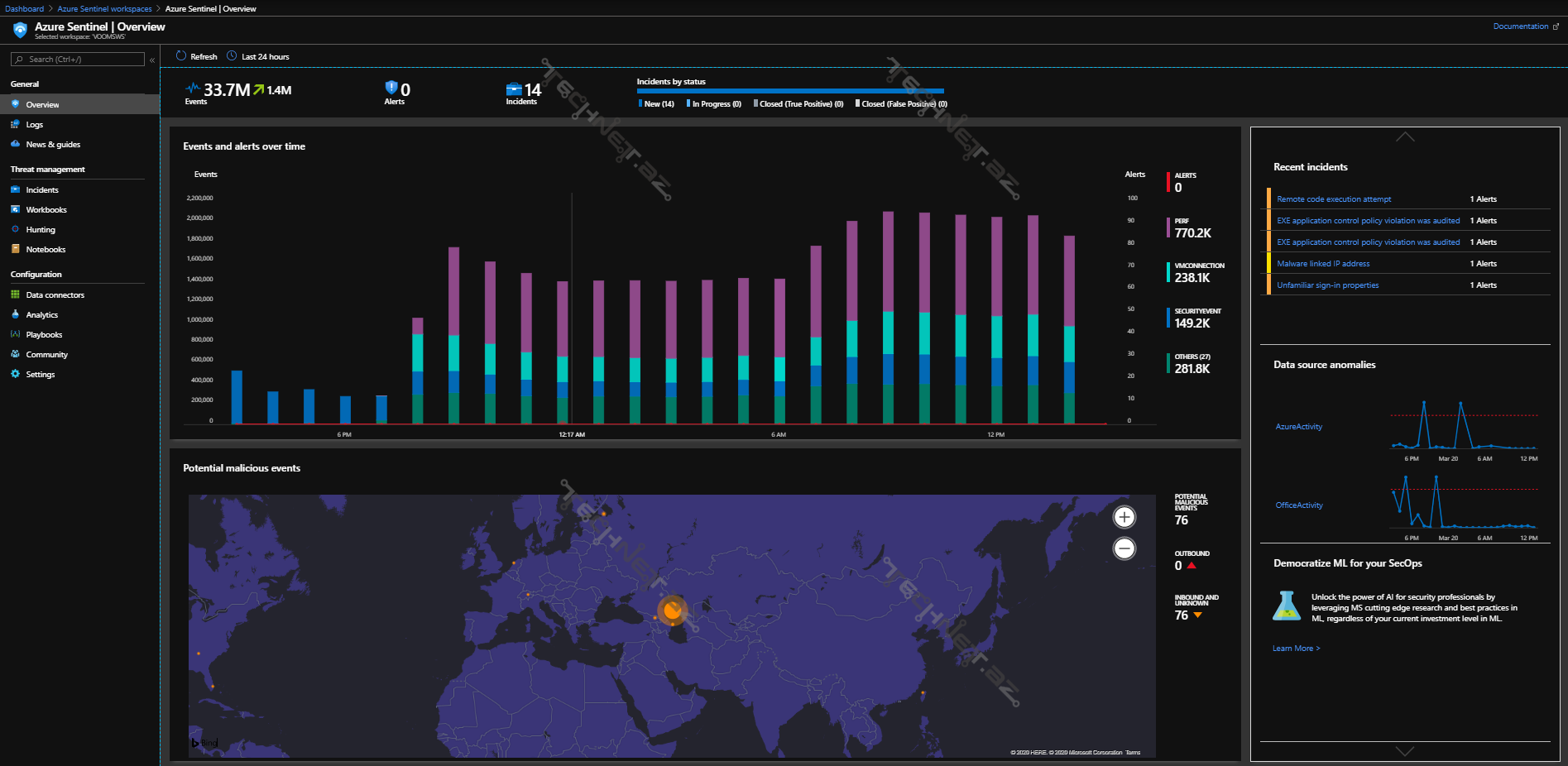 Məlumat mənbələrinə (Data Sources) qoşulduqdan sonra, Azure Monitor Workbooks vasitəsi ilə infrastrukturun ümumi təhlükəsizlik komponentləri barədə statistik məlumatlar əldə etmək mümkündür. Workbook – lar Azure Sentinel sistemində built-in olaraq mövcud olsa da, siz öz istəyinizə uyğun (Custom) workbook yarada bilərsiniz.