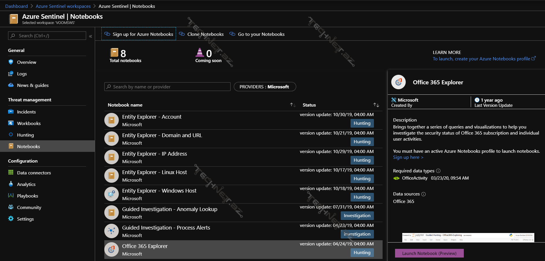 Bir çox əməliyyatları portaldan kənarda icra etmək imkanı yaradan Jupiter, məlumatların emal edilməsi üçün əlavə funksionallıqlar təklif edir. Jupiter Machine learning, vizualizasiya və məlumat analizləri üçün istifadə oluna bilən fərqli proqramlaşdırma dillərin özündə birləşdirir. Azure Sentinel Notebooks səhifəsi Jupiter ilə inteqrasiya edilmişdir. Kqlmagic kitabxanası Azure Sentinel daxilində yazılmış sorğuların Jupiter notebook-da tətbiqinə imkan yaradır. Sorğular Kusto Sorğu Dilindən (KQL) istifadə edərək yazılır. Bir neçə notebbok-lar Microsoft təhlükəsizlik əməkdaşları tərəfindən hazırlanaraq Azure Sentinel portalına yerləşdirilib. İstəyə uyğun olaraq əlavə notebook-ları Azure Community GitHub dan yükləmək olar.