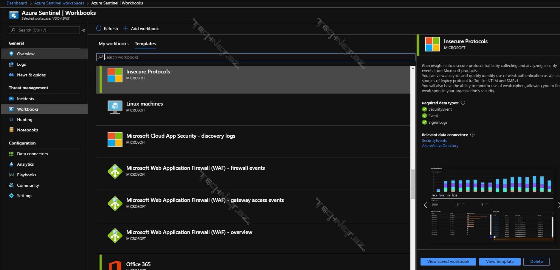 Workbook-lar Azure Sentinel mühitində bir növ şablon (Template) funksiyasını həyata keçirdir. Nümunə üçün İnfrastrukturda legacy (köhnə) formada autentifikasiya metodlarından olan NTLM v1 metodu istifadə edilirsə bu barədə ümumi statistikanı və ətraflı məlumatı Insecure Protocols workbook vasitəsi ilə əldə edə bilərsiniz.