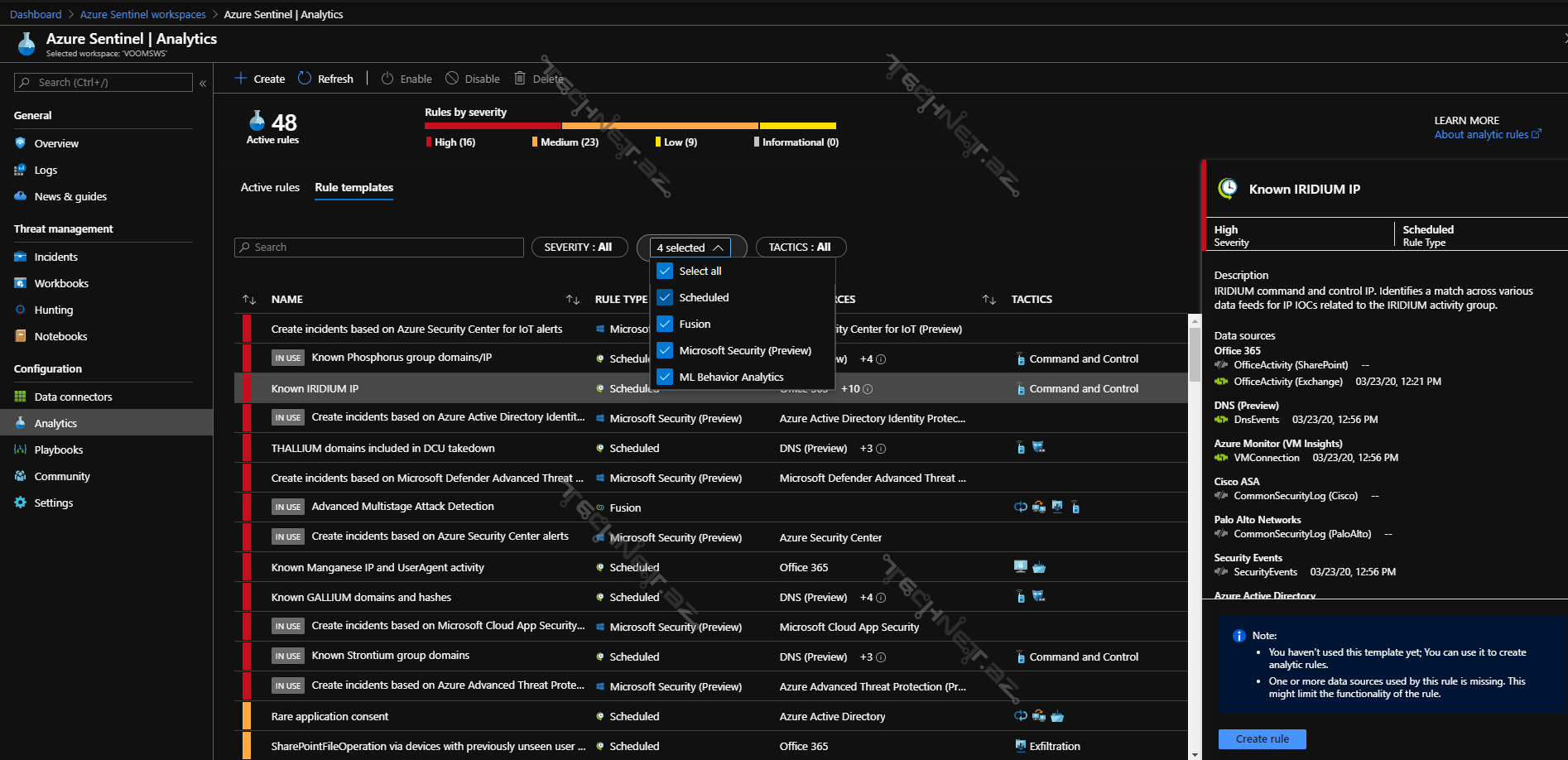 Qeyd olunan funksiya vasitəsilə lazımsız xəbərdarlıqları ləğv edə və müəyyən template-lər əsasında sizə lazım olan hadisə növlərin təyin edə bilərsiniz. Azure Sentinel sistemin ilk dəfə qurduğunuz zaman bu səhifədə built-in qaydalar təyin edilmiş olur. İstəyə uyğun olaraq yeni qaydalar yarada və ya built-in şəkildə təqdim olunan şablonlarda dəyişikliklər edə bilərsiniz.