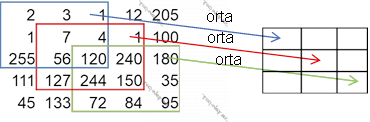 • Orta qiymət. Bu yanaşma ilə seçilmiş regiondakı piksellərin ədədi ortası tapılır. Pulinq əməliyyatı ilə çevrilmiş şəklin pikselləri aşağıdakı kimi müəyyən olunur: