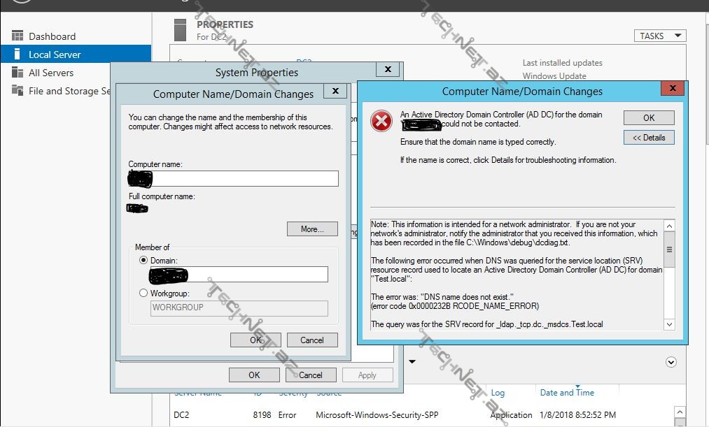 Salam dostlar. Bir məsəslədə köməyinizə ehtiyacım var. Qurduğum bir serveri domenə qoşmaq istəyirəm. Aşağıdakı kimi error çixir. Internetdə baxdim SRV recordla bağli bir şey tapdim, amma yenə heçne alinmadi. Nece hell ede bilerem bunu? Hər iki serverdən bir birinə ping gedir.