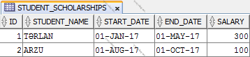 Mən oracle sql-də tələbənin adını (STUDENT_NAME), təqaüd almağa başladığı tarixi (START_DATE), təqaüdün bitmə tarixini (END_DATE) və təqaüdün miqdarını (SALARY) saxladığım STUDENT_SCHOLARSHIPS adlı cədvəl yaratmışam. Cədvəl aşağıdakı kimidir: