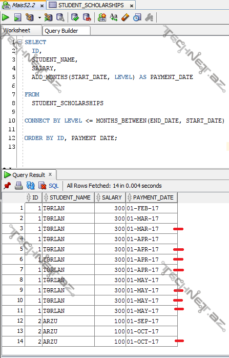 İstəyirəm ki, tələbənin hansı tarixlərdə təqaüd alacağını görüm. Bunun üçün aşağıdakı sorğunu işlətmişəm: