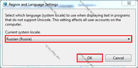 4. Açılan pəncərədə, “Current system locale:” altında “Russian (Russia)” seçin.